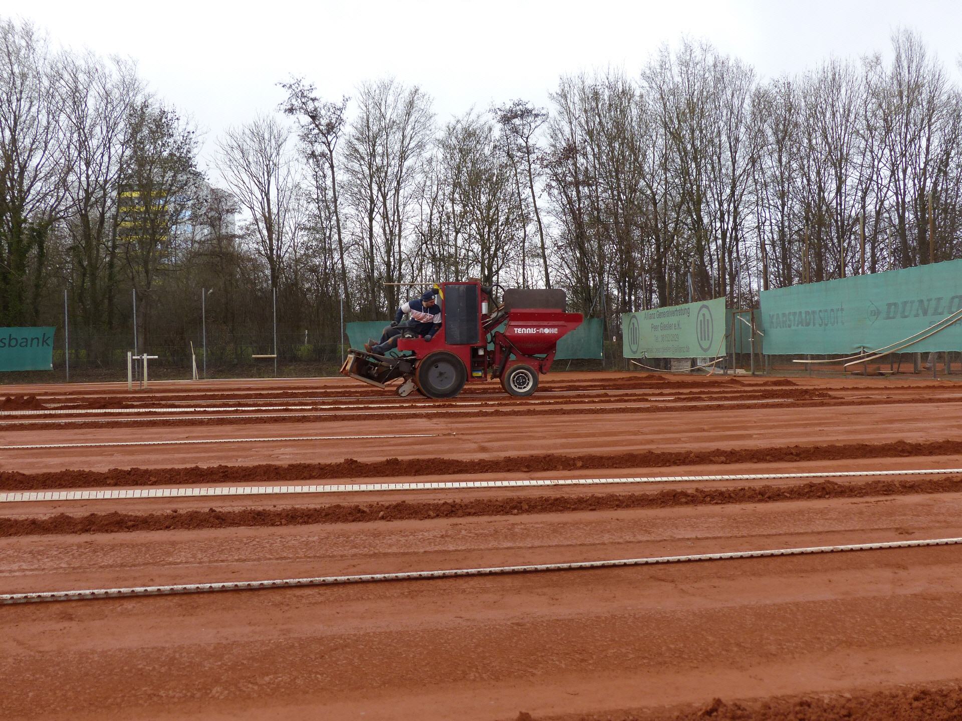Es war eine ereignisreiche Woche, erst die Vandalen, die auf dem Gelände viel Schaden angerichtet haben, dann mit Verzögerung die Frühjahrs-Instandsetzung durch die Firma Nohe, und zuletzt haben unsere Platzwarte noch die Bäume am Zaun abgeschnitten. Wir hoffen, dass dadurch die Feuchtigkeit auf den Plätzen 1-3 die Plätze besser abtrocknet und außerdem waren mehr als die Hälfte der Bäume schon abgestorben.